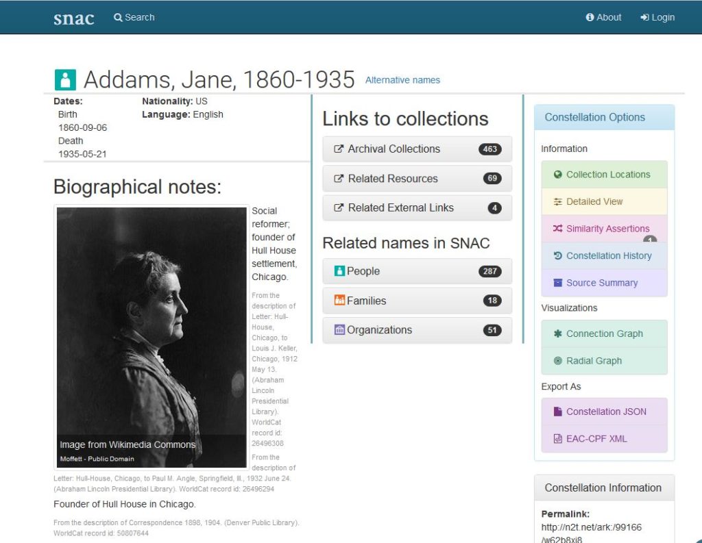 I am pleased to announce that the Jane Addams Papers will be joining the Social Networks and Archival Context (SNAC) Cooperative in its final phase of work. SNAC has been hosted by the University of Virginia’s Institute for Advanced Technology in the Humanities and the University Library and funded by the National Endowment for the Humanities (2010-2012) and the Andrew Mellon Foundation (2012-2017). The Cooperative seeks to improve the economy and quality of archival processing and description, and build a global social-document network using both computational methods and human curation.