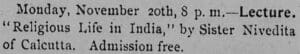 After Sister Nivedita delivered a lecture at Hull-House on November 20, she wrote: “Last night at Hull House I really did feel that we had had Swami’s blessing…60 or 70 people stayed about 1½ hour to ask questions about the philosophy. And such intelligent questions too!” Sister Nivedita was impressed with the settlement and inspired by Jane Addams and Ellen Gates Starr (“I love her so much,” she later wrote of Starr). Sister Nivedita gave at least two more lectures at Hull-House, including one to the Chicago Arts and Crafts Society entitled “The Ancient Arts of India.”
