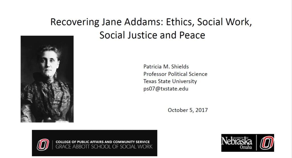 Patricia M. Shields, Recovering Jane Addams: Ethics, Social Work, Social Justice and Peace, Grace Abbott School of Social Work, University of Nebraska Omaha, October 2017.