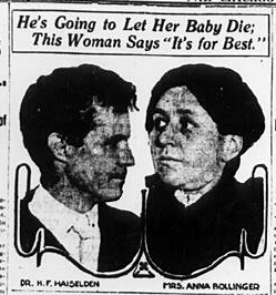 A little over 100 years ago, the case of an infant allowed to die in a Chicago hospital captured the nation’s attention. Born on November 12, 1915, “Baby Bollinger” died five days later on November 17, after physician Harry Haiselden refused to operate to save his life. Haiselden made his decision because the child was born with deformities and he believed the the boy was was mentally and morally defective. He convinced the child’s mother, who said “the doctor told me it would be, perhaps, an imbecile, a criminal. Left to itself it has no chance to live. I consented to let nature take its course.” (Boston Globe, Nov. 17, 1915, p. 1.) Haiselden’s controversial decision led to a heated debate in newspapers across the country. Continue reading “The Tragic Case of Baby Bollinger”