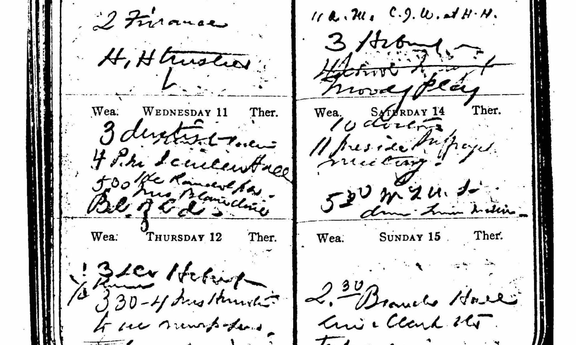 Over the past couple of years, as I’ve worked to contextualize the documents we have chosen to publish in Volume 4 of The Selected Papers of Jane Addams, I have made a good effort to decipher Jane Addams’s engagement diary. She kept an annual engagement calendar during most of her years in Chicago, although some of them are more rich with details about her life than others. As with any such diary a person keeps, the diaries we have for Jane Addams are riddled with abbreviations and cryptic notes, and some entries are impossible to understand. Addams’s handwriting, which was abominable even in her professional correspondence, is particularly illegible in these private diaries, and the microfilm images we use at the Jane Addams Papers Project (the originals are located in the Jane Addams Memorial Collection at the University of Illinois Chicago) add to the difficulty. Yet despite all the problems with reading these diary entries, they are invaluable.