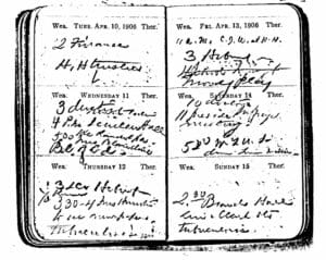 Snapshots of these calendar entries offer a good sense of the cadence of Addams’s life, especially when she was in Chicago. They help us track her meetings and lectures, doctor’s appointments, and her special engagements, likes dinners and teas, with friends, family, and fellow reformers. Sometimes Addams would record the speaking fee she collected for a speech, particular trains on which she traveled, or the people she stayed with when she was on the road. Other entries indicate various Hull-House activities she attended or groups she hosted at the settlement. And particularly exciting for me as an editor ferreting out Addams’s daily life and activities, often a diary entry corroborates something Addams mentioned in her correspondence or, better still, provides the definitive clue that helps me unlock the mystery of a vague reference in a letter.