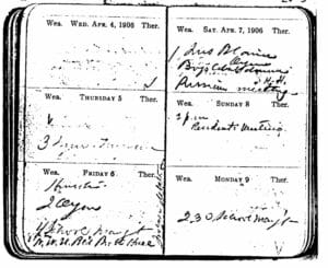 By way of celebrating this hidden treasure chest of documents, I thought it might be fun to offer a Day in the Life of Jane Addams. I’ve chosen a week in the spring of 1906, when Addams was up to her eyeballs with work as a leading member of the Board of Education of the City of Chicago. From the images I’ve provided, you can see for yourself what we are up against with Jane Addams’s dreadful penmanship and get a feel for her daily life. For each day in the calendar, I offer a translation of her entries, followed by sources, which corroborate or contextualize the entries or add the fullness of particular day.