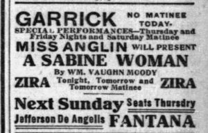I have no clue what “C.J.W.” might be, but I suspect it was an organization (Chicago Council of Jewish Women, perhaps?) rather than a person; and there is that mysterious Hebert again. A Board of Education School Management Meeting was cancelled. And finally some leisure for Addams in the evening, when she went to the Garrick Theatre in Chicago to see a play. The theater was in the Schiller Building, which was designed by architects Louis Sullivan and Dankmar Adler.