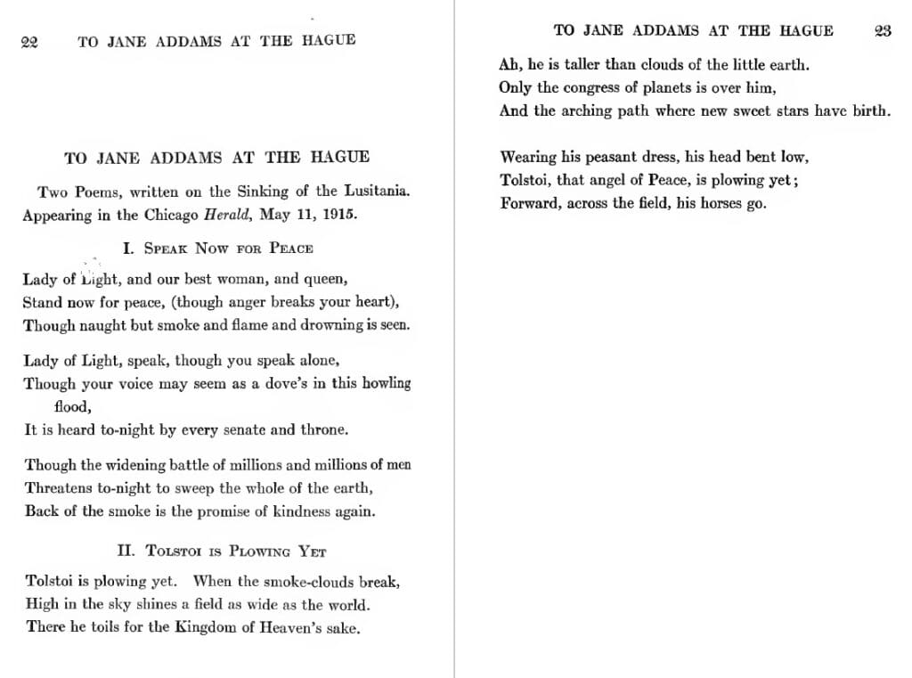 story of his life. When I read his letter to Addams, I recalled that Lindsay had written a poem about her, inspired by her peace trip to Europe in 1915. However, I was unaware he knew Addams personally nor that he had corresponded with her. The Jane Addams Digital Edition includes four letters from Lindsay to Addams, each revealing something of the poet’s respect for and fascination with Addams and with Hull-House. In an October 1916 letter, Lindsay proclaimed: “I have loved you a long time dear lady.”
